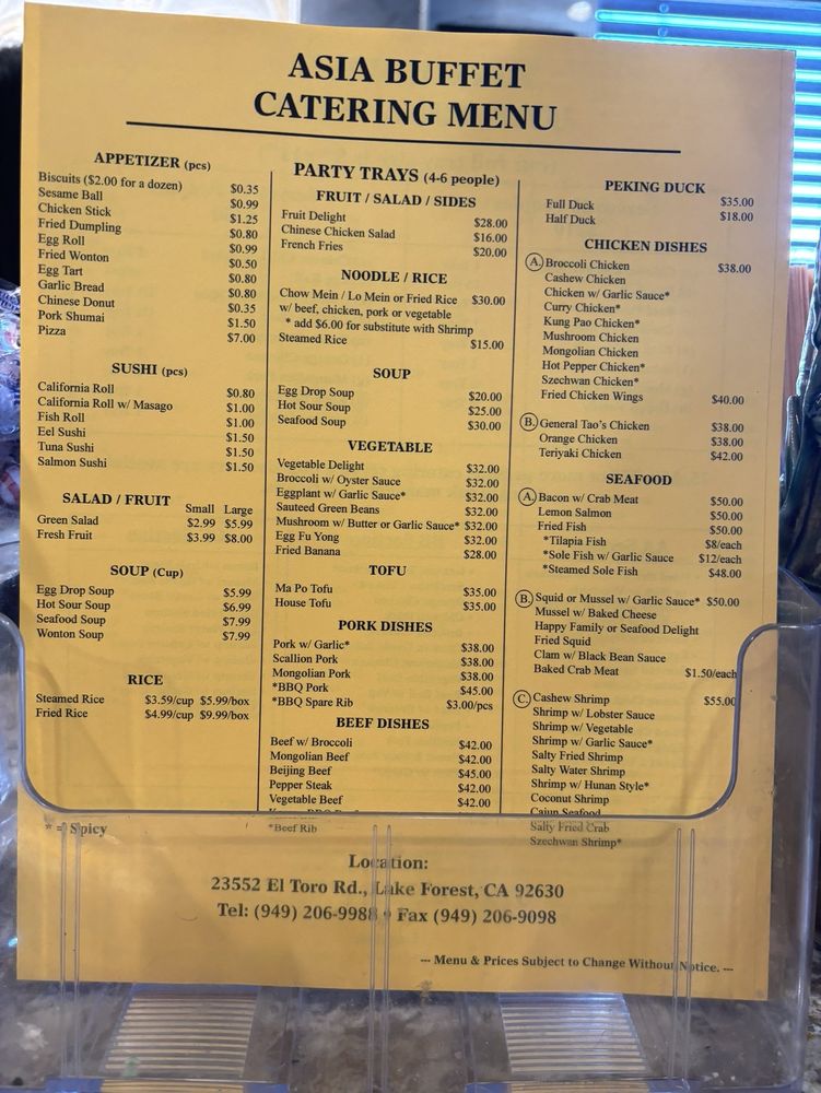 Introducing Asia Buffet, a Japanese and Chinese cuisine haven in Lake Forest, CA. This spot offers a variety of amenities such as delivery, takeout, vegan options, and a plethora of vegetarian choices. Their menu provides an array of appetizers like fried dumplings and sesame balls. The soup selection includes favorites like egg drop and seafood soup. Customers rave about the freshness and quality of the food, especially highlighting the sushi, seafood, and classic Chinese dishes. While the ambiance may not be exceptional, the delicious food makes up for it. Prices are reasonable, and there is ample parking. With attentive service and a wide array of options, Asia Buffet is a must-visit for Asian cuisine lovers in the area.